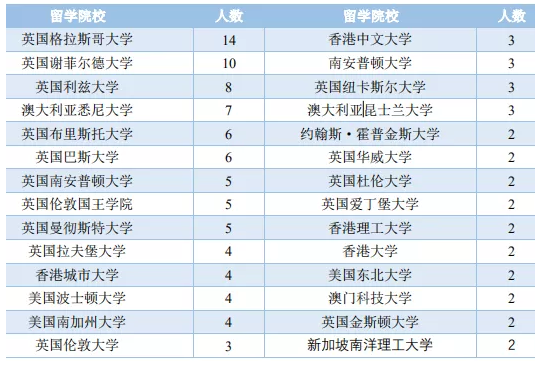 共计 182 人,留学院校主要为英国格拉斯 哥大学(14 人)、英国谢菲尔德大学(10 人)等。